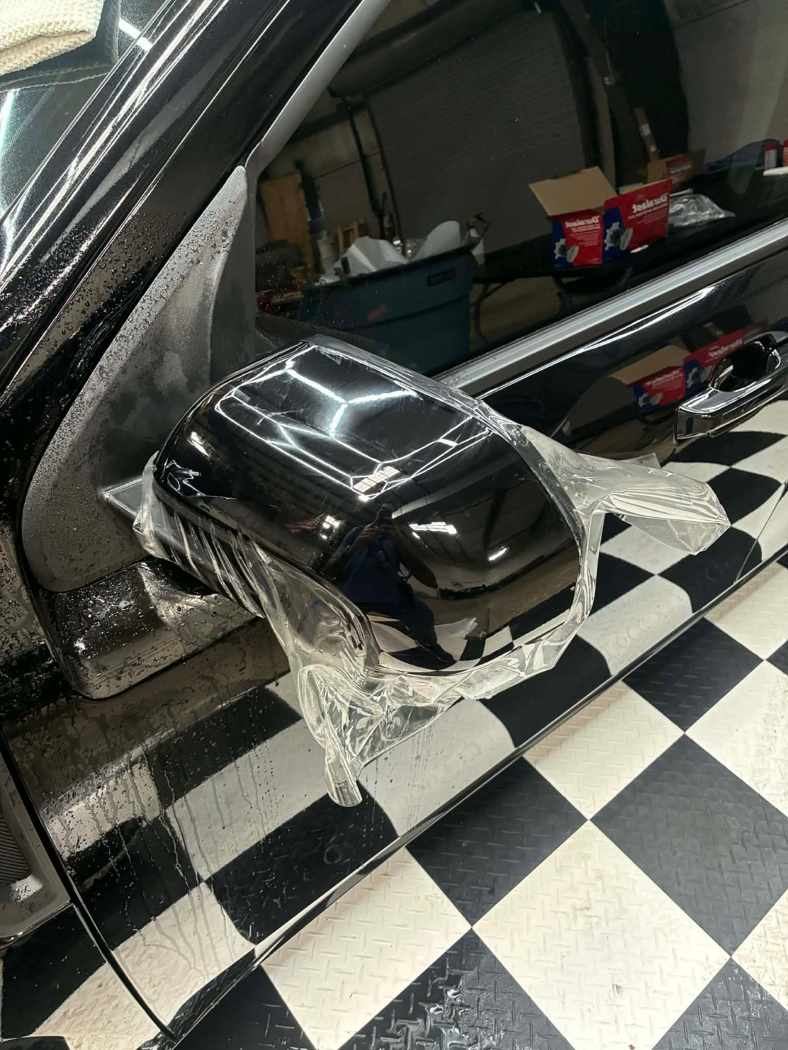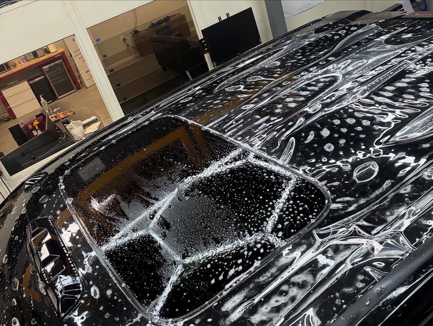 We perform a full decontamination wash and inspect the existing paint condition to ensure proper film adhesion.